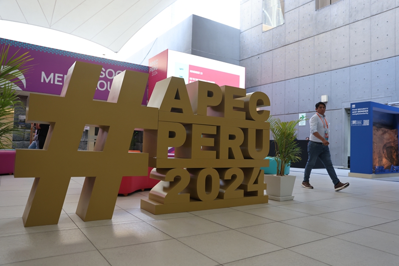 11月13日,人們從秘魯首都利馬會(huì)議中心外的2024年亞太經(jīng)濟(jì)合作組織(APEC)會(huì)議標(biāo)識前走過。新華社發(fā)(瑪麗安娜·巴索 攝)