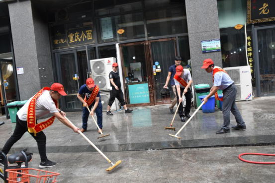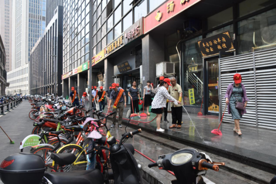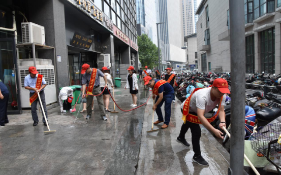 二、“全城清潔”行動(dòng)。清潔家園,黨員志愿者義不容辭。日前,市建投聯(lián)合商務(wù)社區(qū)積極響應(yīng)“全城清潔”行動(dòng)號(hào)召,定期組織志愿者對(duì)社區(qū)單位公共區(qū)域、沿街商戶(hù)門(mén)店等內(nèi)外環(huán)境進(jìn)行集中整治。7月14日下午,市建投黨員志愿者分赴中國(guó)人保大廈對(duì)沿街商戶(hù)門(mén)店和街道進(jìn)行集中清理。大清掃活動(dòng)采取包干打掃、分頭行動(dòng)的方式,集中對(duì)沿街商鋪門(mén)店垃圾桶(池)、地面污漬等進(jìn)行清洗,全面清理整治各類(lèi)衛(wèi)生死角,清理積存垃圾,杜絕垃圾亂堆亂放。烈日炎炎,市建投黨員志愿者們絲毫不懼37度的高溫,頭戴小紅帽,戴著紅袖標(biāo),以高度的敬業(yè)態(tài)度和為人民服務(wù)的無(wú)比熱情,全身心投入到環(huán)境衛(wèi)生清理中,通過(guò)2個(gè)小時(shí)的辛苦勞動(dòng),使人保大廈沿街門(mén)店商鋪和街道面貌煥然一新。