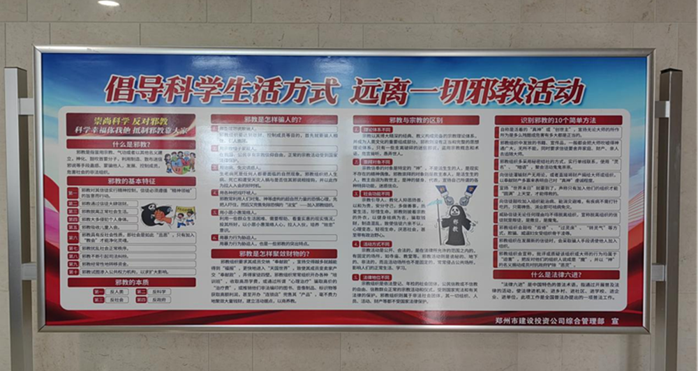 為了進(jìn)一步提高國(guó)企員工反邪教意識(shí),認(rèn)識(shí)邪教的危害,切實(shí)增強(qiáng)自覺抵御邪教侵蝕的能力,營(yíng)造積極向上、健康和諧的工作氛圍。4月25日下午,鄭州市建設(shè)投資集團(tuán)有限公司組織全體干部員工開展反對(duì)邪教宣傳活動(dòng)。利用PPT宣講、宣傳展板、網(wǎng)站、懸掛橫幅等方式,向員工宣傳邪教的種類、危害和邪教組織的種類等,引導(dǎo)國(guó)企干部職工認(rèn)清邪教本質(zhì),提高識(shí)邪、防邪、拒邪能力,筑牢反邪教思想防線,做到對(duì)邪教歪理邪說(shuō)不聽、不看、不信、不傳。